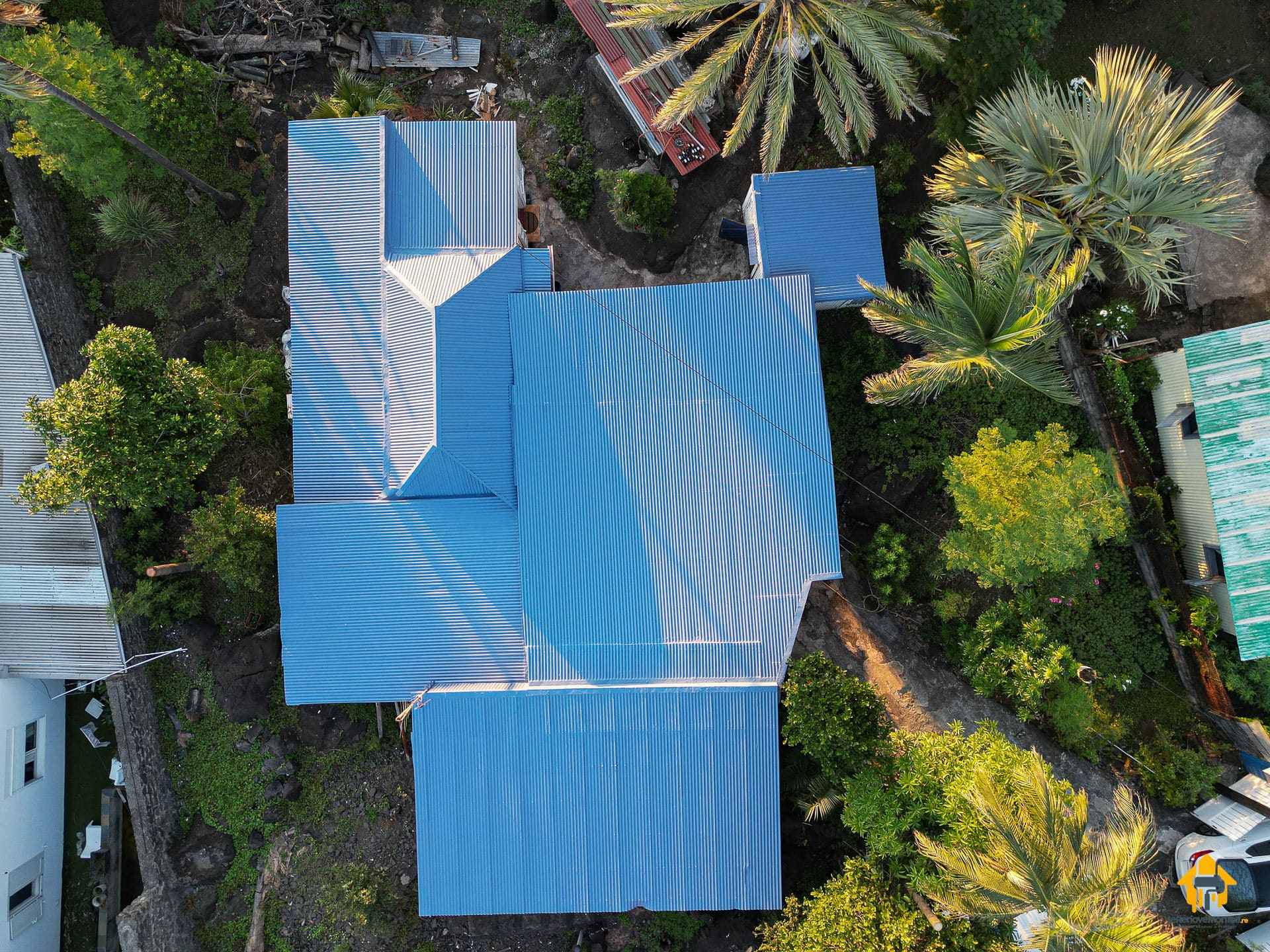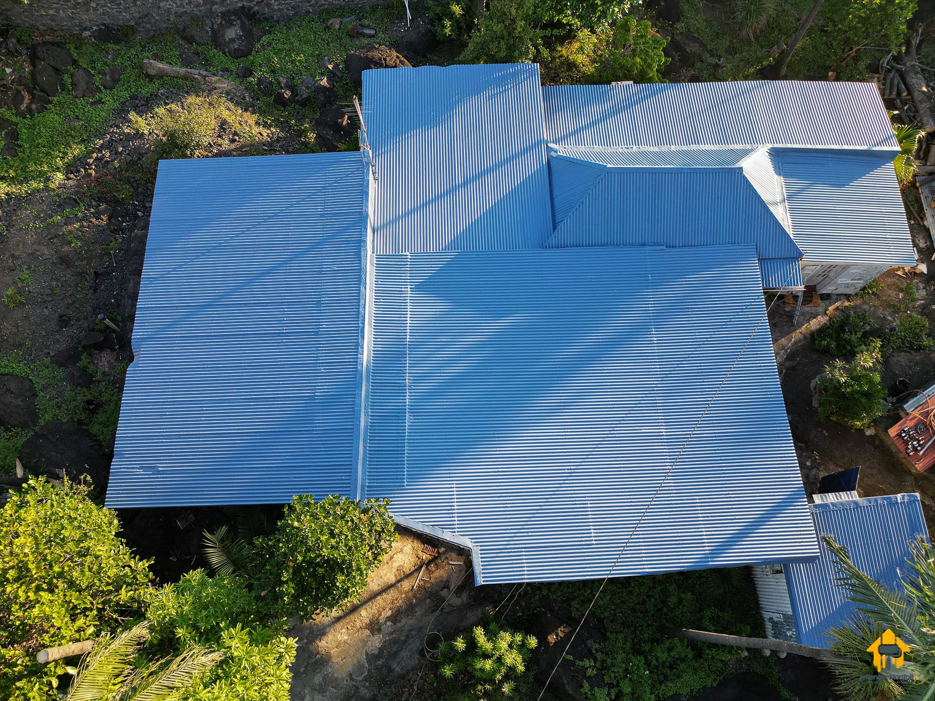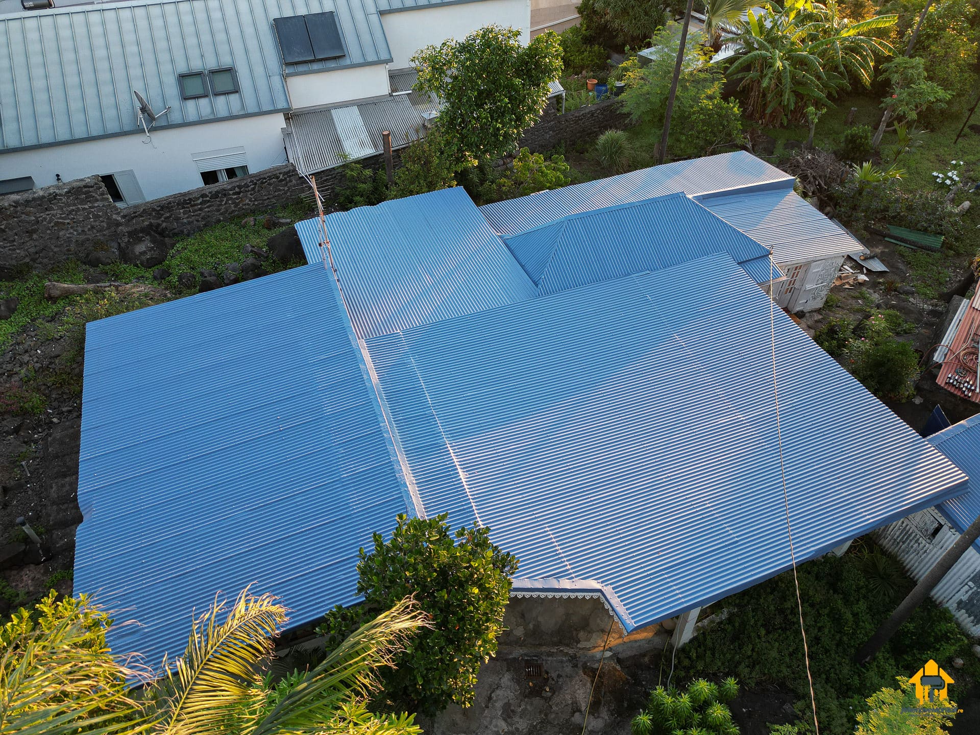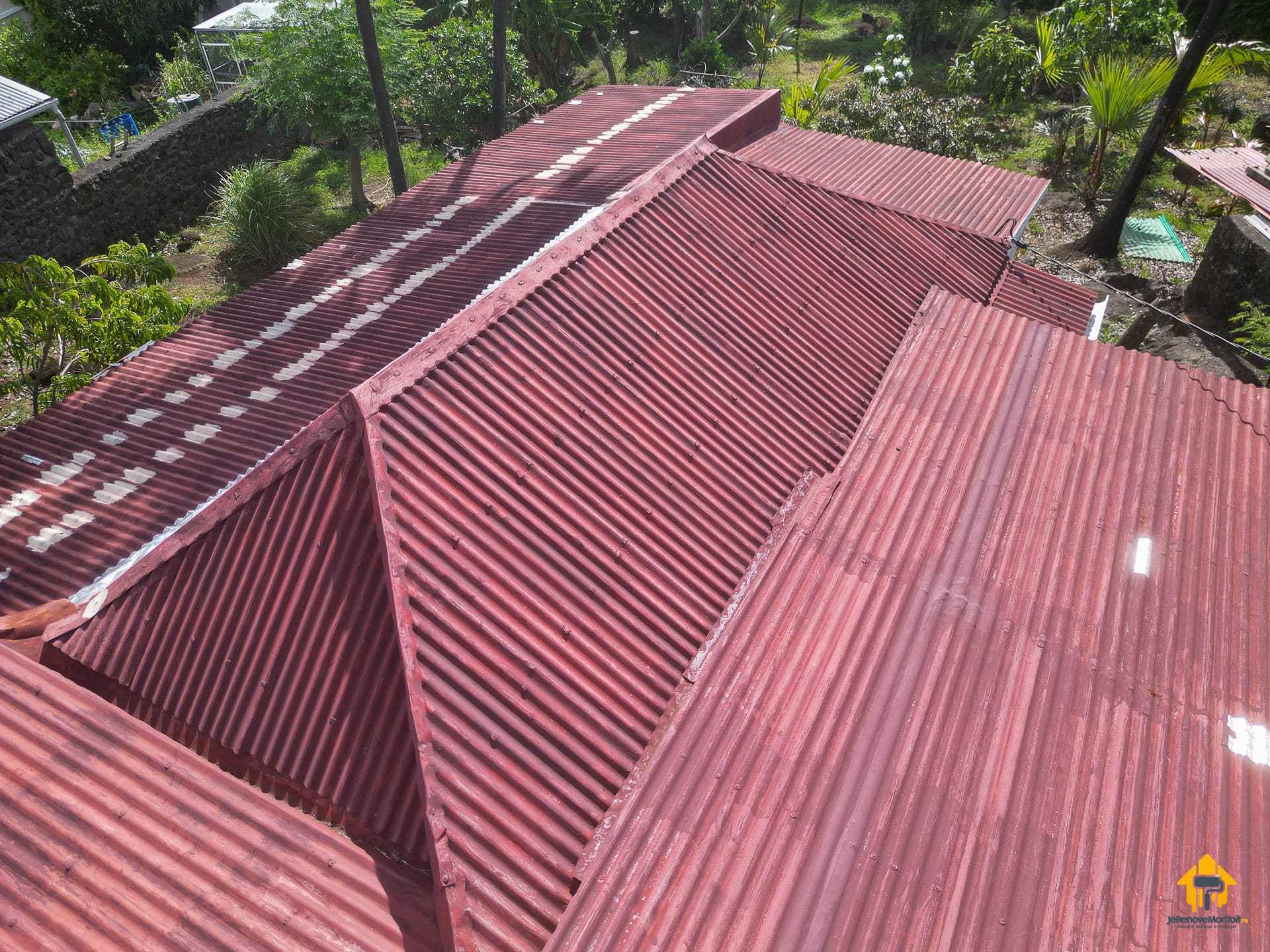 Une belle histoire et un vrai défi. Cette toiture de plus de 50 ans, posée à deux pas de la mer à Terre Sainte, a traversé cyclones, embruns et saisons d’alizés. Avec le temps, la rouille s’est installée et les fuites se sont multipliées. Remplacer toute la tôle sur plus de 200 m² aurait été coûteux, d’autant que l’architecture est riche et complexe, composée de plusieurs pans, des parties plates, des pentes différentes, fruits d’agrandissements successifs au fil des années. Nous avons abordé cette configuration singulière avec respect et méthode, pour préserver le cachet de la maison sans la dénaturer.