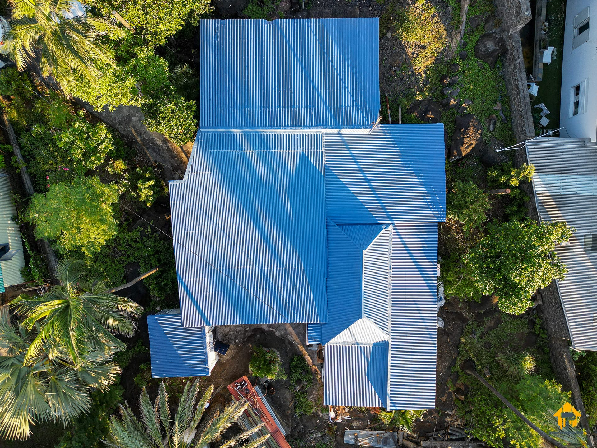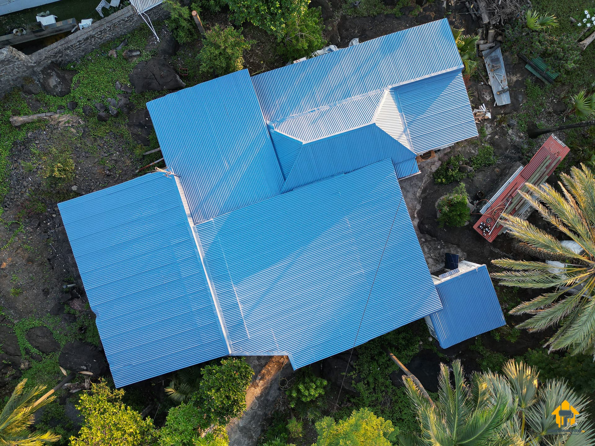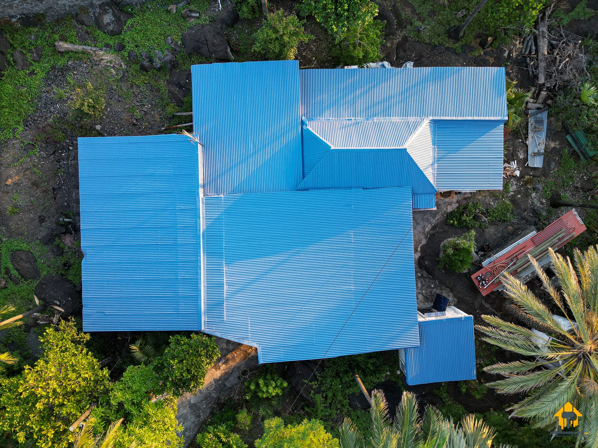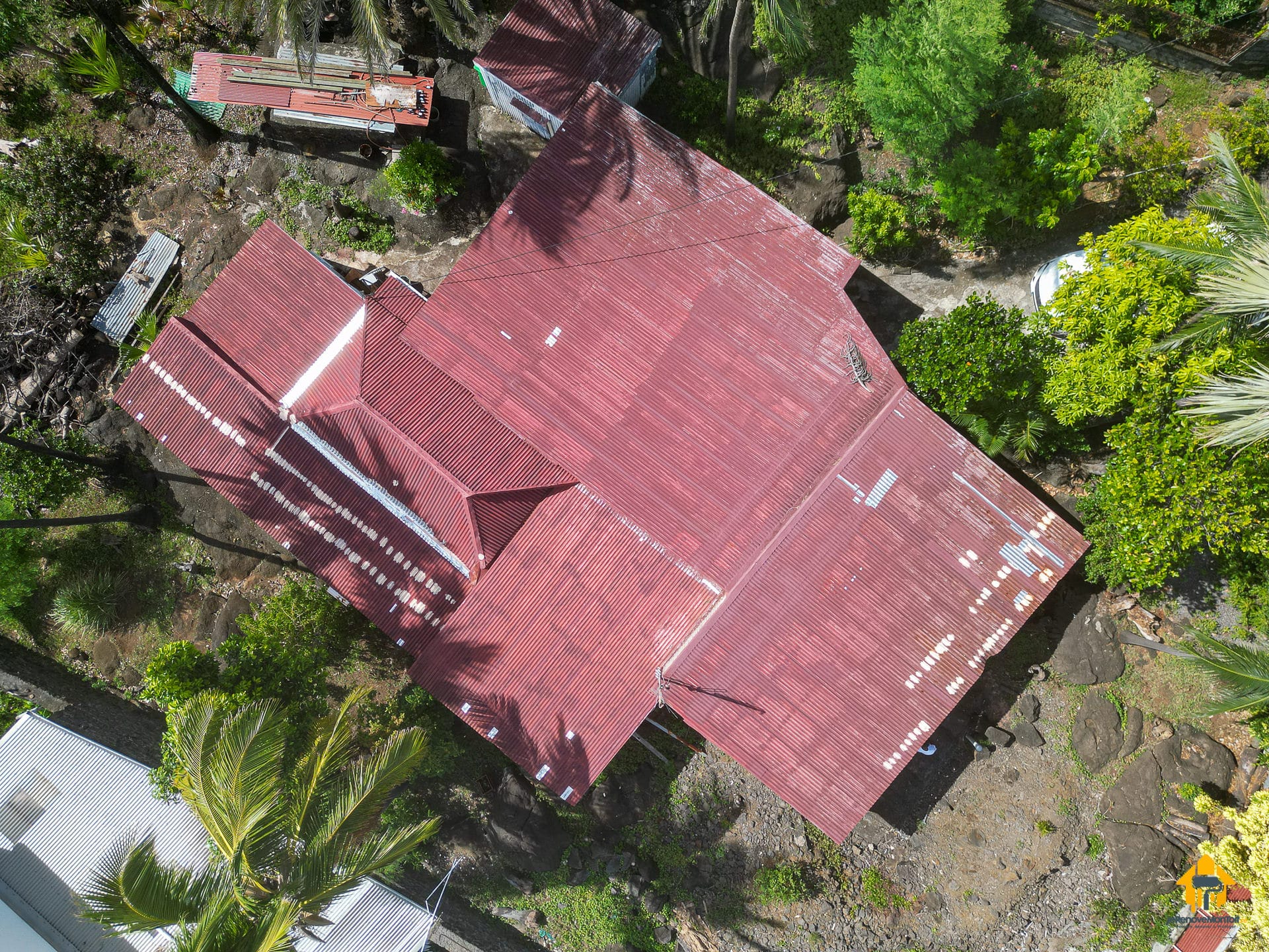 Une belle histoire et un vrai défi. Cette toiture de plus de 50 ans, posée à deux pas de la mer à Terre Sainte, a traversé cyclones, embruns et saisons d’alizés. Avec le temps, la rouille s’est installée et les fuites se sont multipliées. Remplacer toute la tôle sur plus de 200 m² aurait été coûteux, d’autant que l’architecture est riche et complexe, composée de plusieurs pans, des parties plates, des pentes différentes, fruits d’agrandissements successifs au fil des années. Nous avons abordé cette configuration singulière avec respect et méthode, pour préserver le cachet de la maison sans la dénaturer.