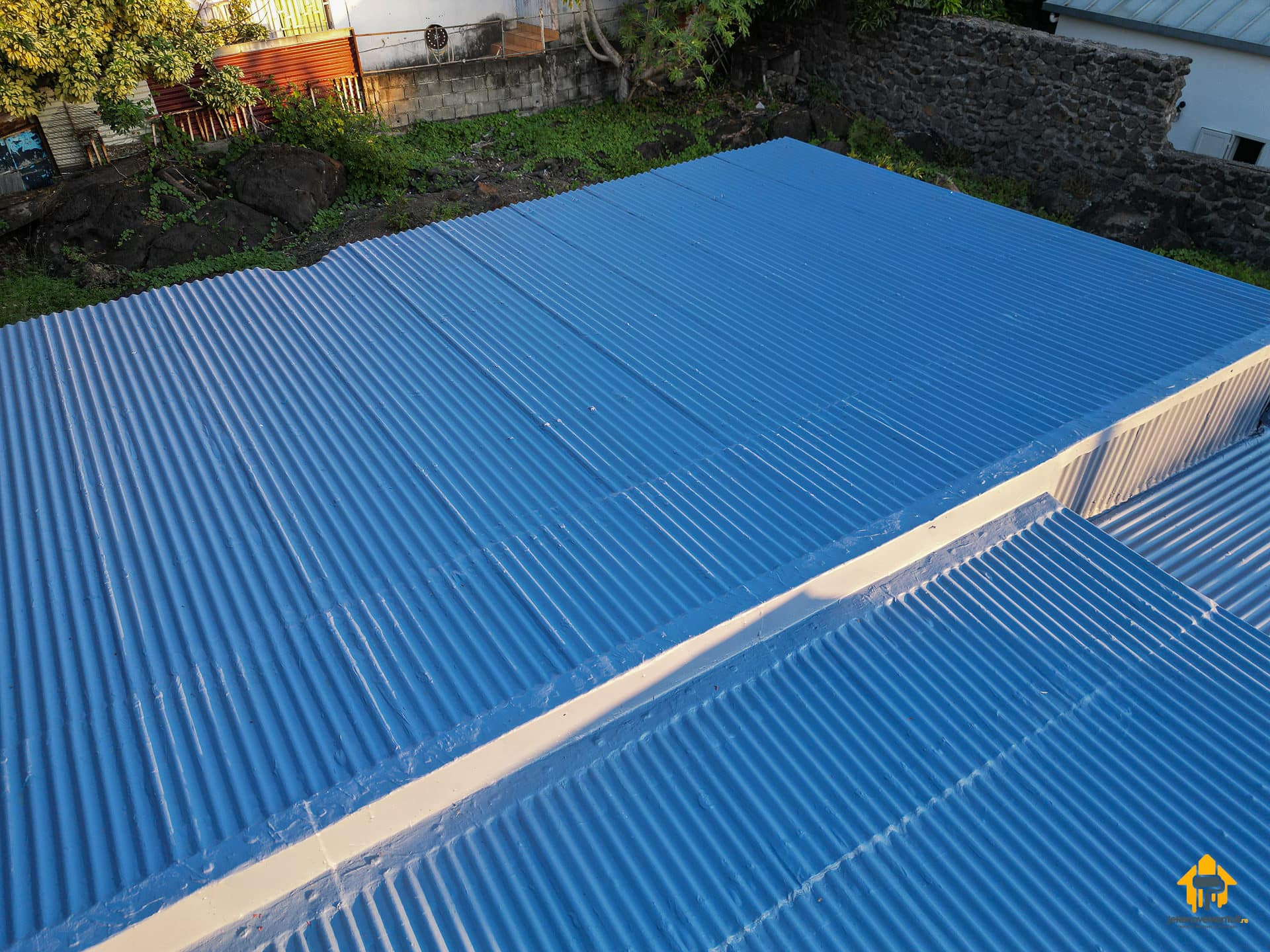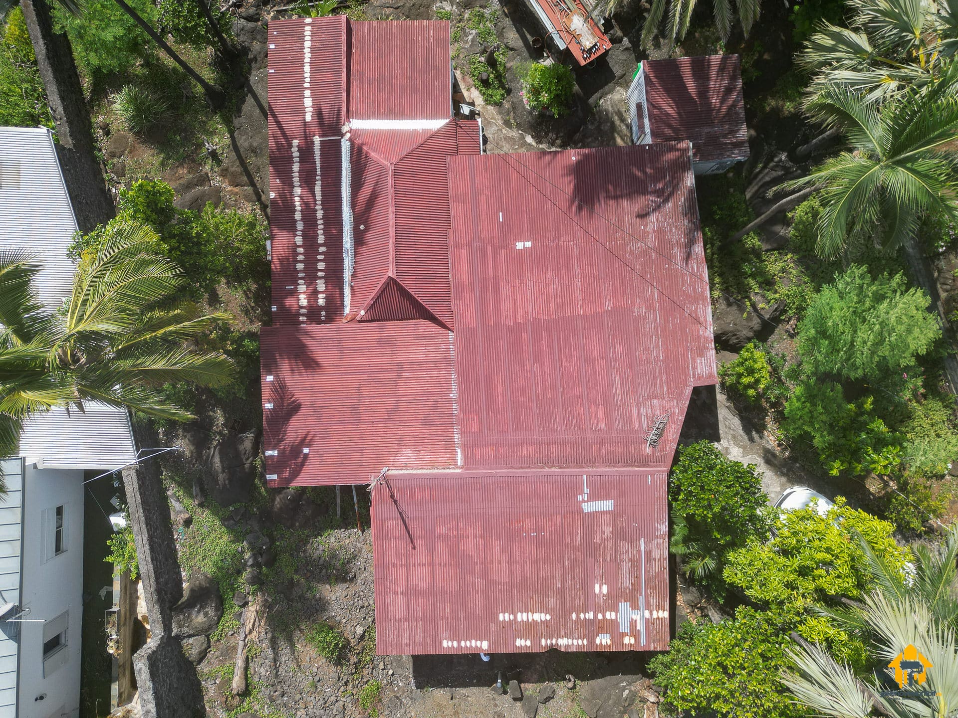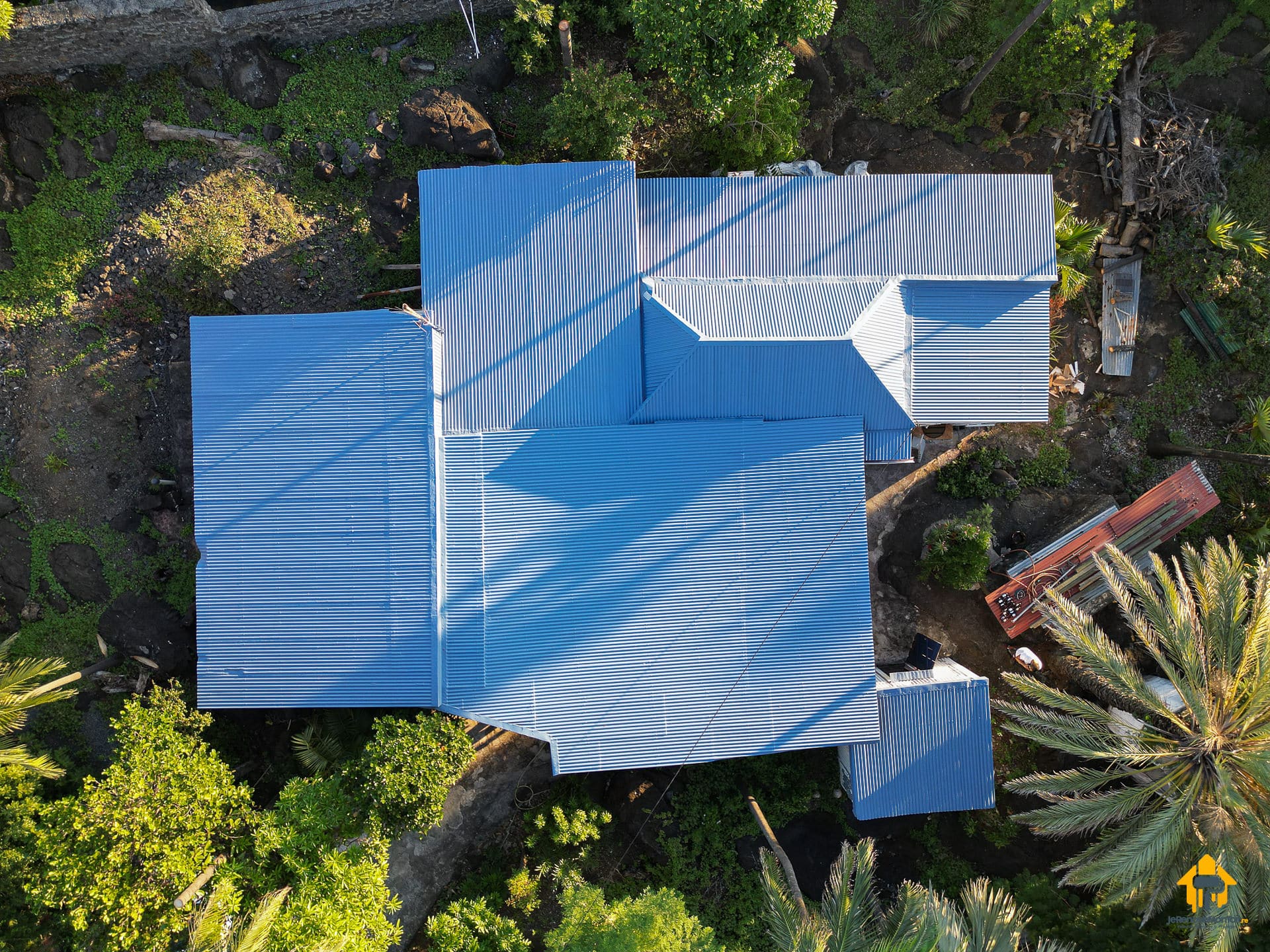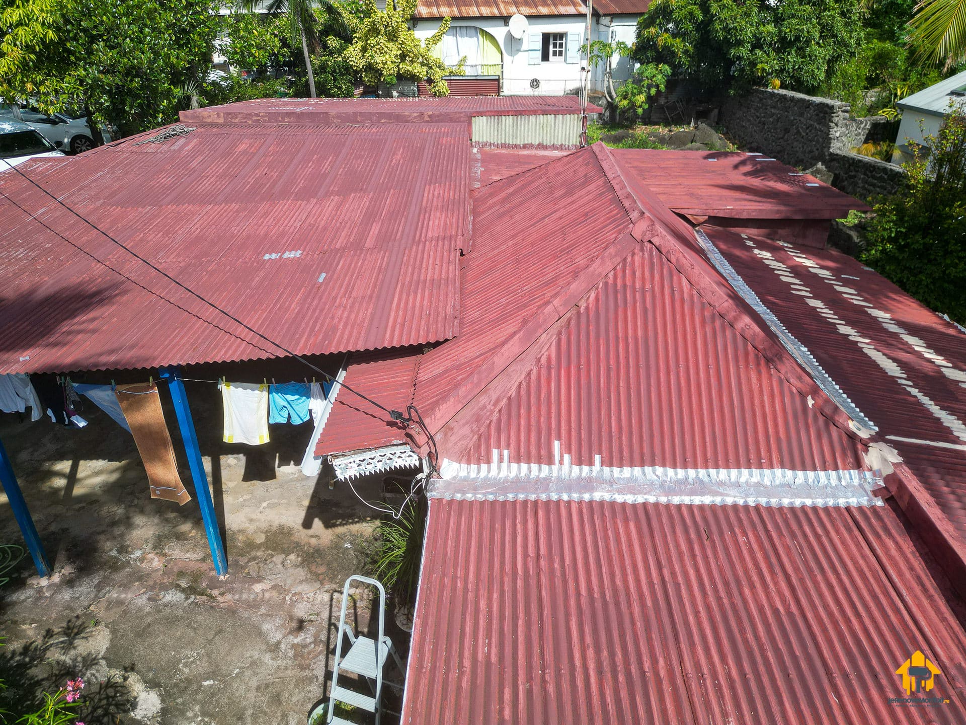Une belle histoire et un vrai défi. Cette toiture de plus de 50 ans, posée à deux pas de la mer à Terre Sainte, a traversé cyclones, embruns et saisons d’alizés. Avec le temps, la rouille s’est installée et les fuites se sont multipliées. Remplacer toute la tôle sur plus de 200 m² aurait été coûteux, d’autant que l’architecture est riche et complexe, composée de plusieurs pans, des parties plates, des pentes différentes, fruits d’agrandissements successifs au fil des années. Nous avons abordé cette configuration singulière avec respect et méthode, pour préserver le cachet de la maison sans la dénaturer.