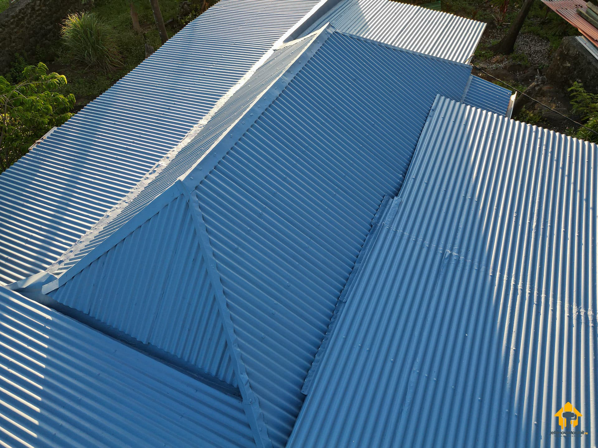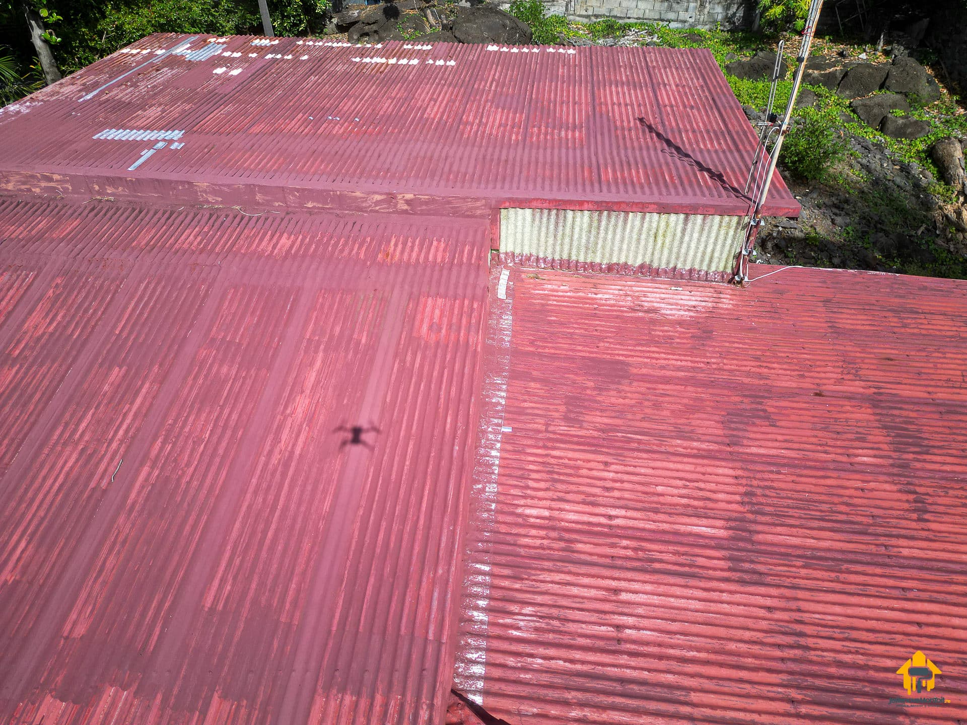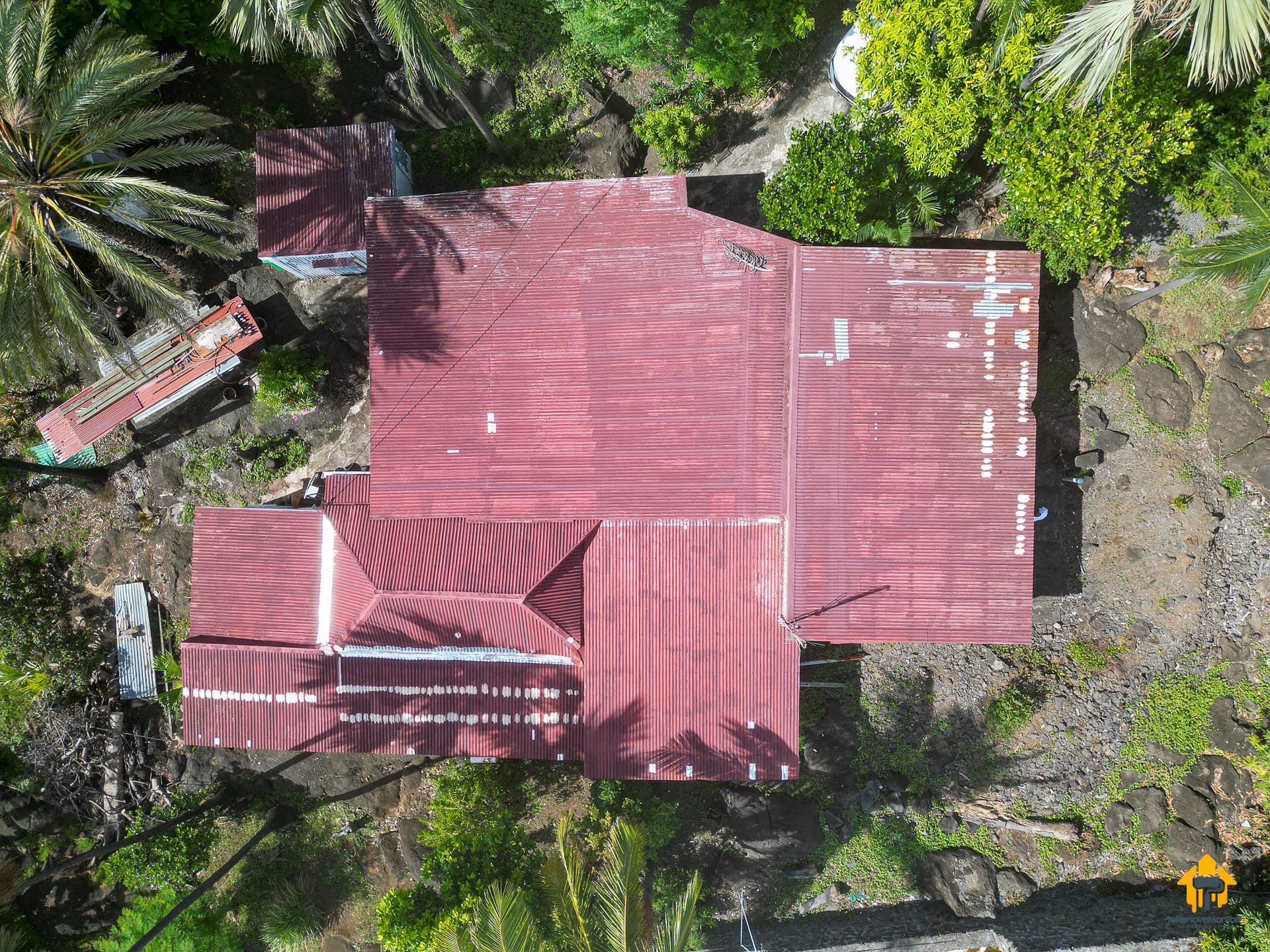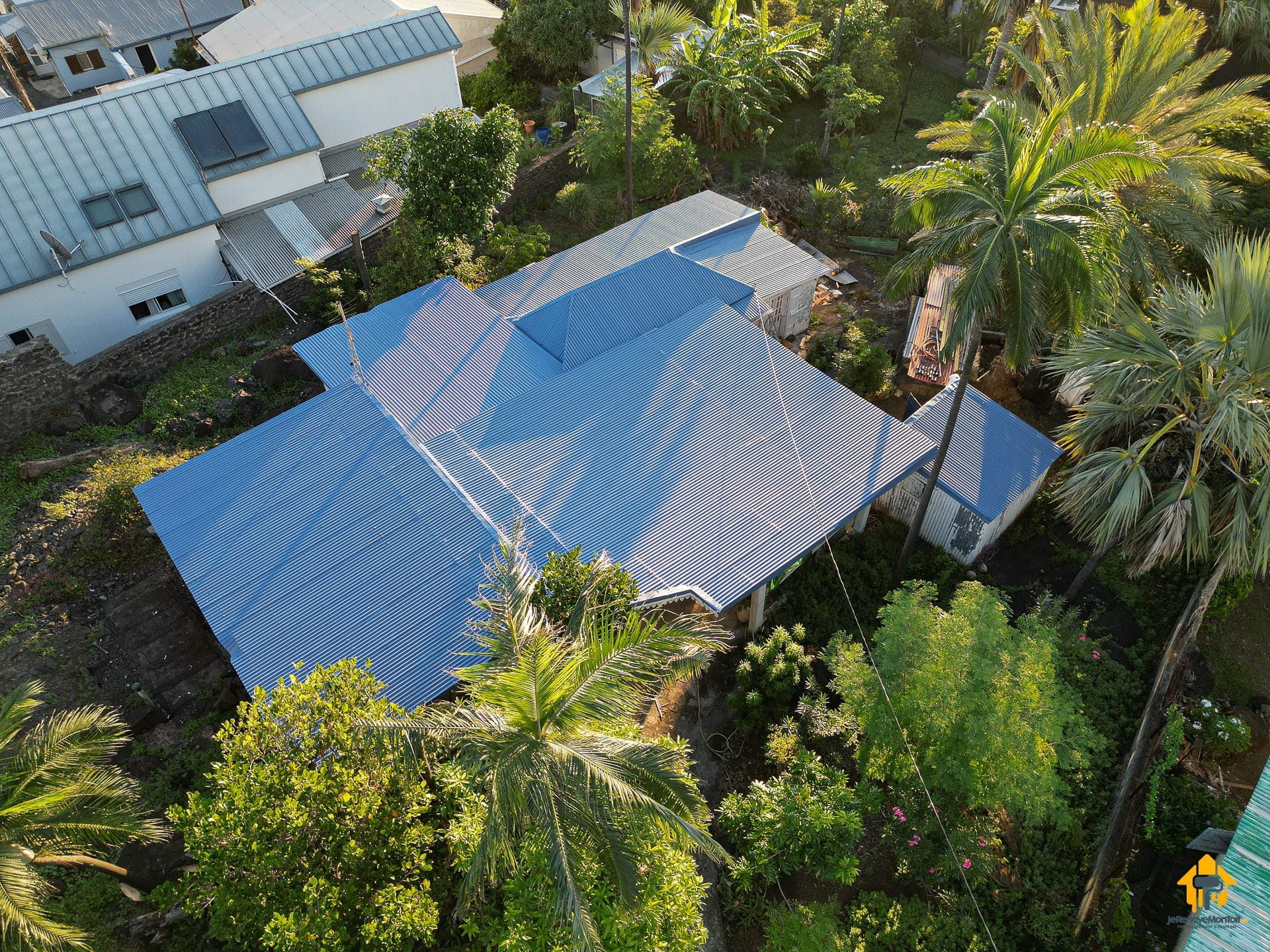 Une belle histoire et un vrai défi. Cette toiture de plus de 50 ans, posée à deux pas de la mer à Terre Sainte, a traversé cyclones, embruns et saisons d’alizés. Avec le temps, la rouille s’est installée et les fuites se sont multipliées. Remplacer toute la tôle sur plus de 200 m² aurait été coûteux, d’autant que l’architecture est riche et complexe, composée de plusieurs pans, des parties plates, des pentes différentes, fruits d’agrandissements successifs au fil des années. Nous avons abordé cette configuration singulière avec respect et méthode, pour préserver le cachet de la maison sans la dénaturer.